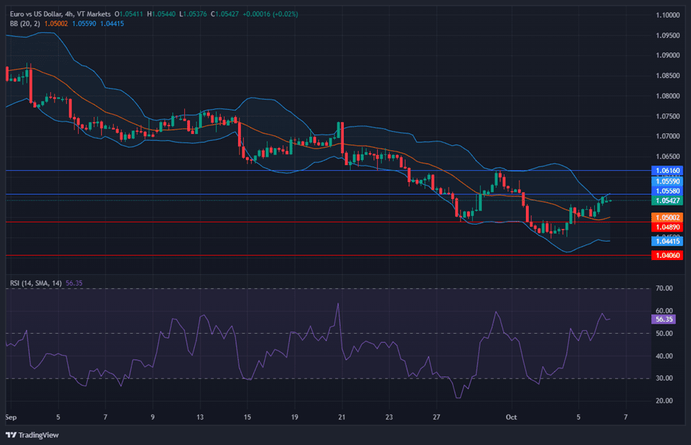 Based on technical analysis, the EUR/USD went up on Thursday and managed to reach the upper band of the Bollinger Bands. Right now, the EUR/USD is trading below the upper band, which suggests a chance for a small downward move to reach the middle band of the Bollinger Bands. The Relative Strength Index (RSI) is at 56, indicating that the EUR/USD is currently trying to return to a neutral position.