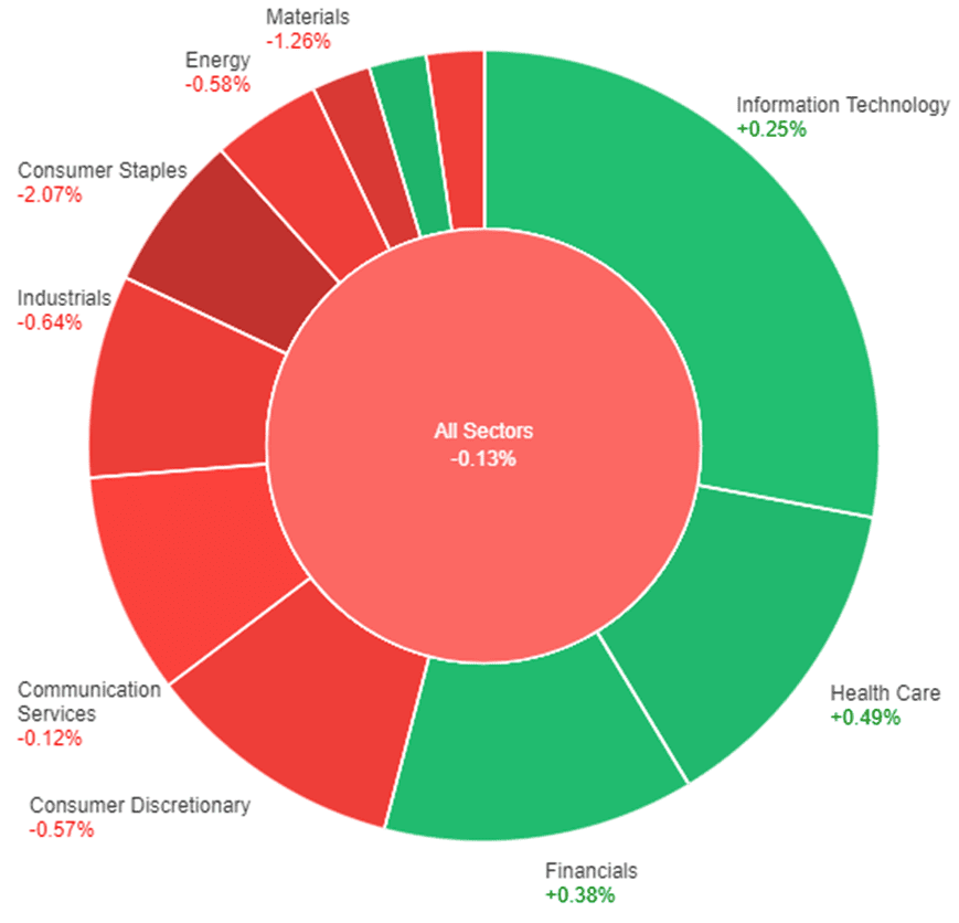 On Thursday, the overall market showed a slight decline of -0.13%. Real Estate and Health Care sectors performed well, with gains of +0.67% and +0.49% respectively. Financials and Information Technology also saw growth at +0.38% and +0.25%. However, Communication Services, Utilities, Consumer Discretionary, Energy, Industrials, and Materials sectors all experienced declines, ranging from -0.12% to -1.26%. Consumer Staples recorded the most significant drop, with a decline of -2.07%.
